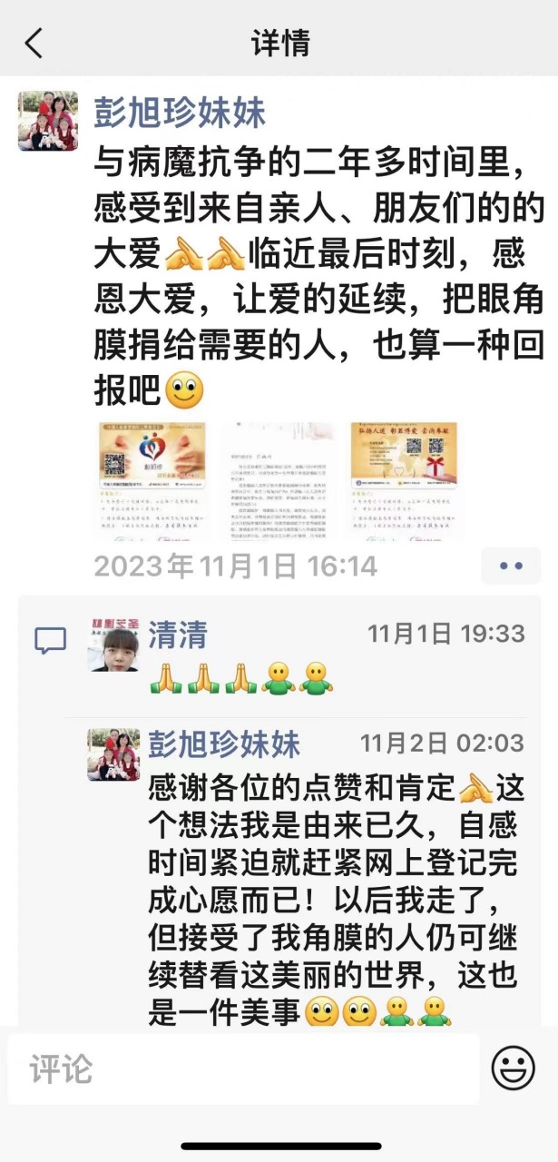 今年10月24日,說話已經非常吃力的彭旭珍拜托哥哥幫她聯(lián)系辦理角膜捐獻登記。由于不了解捐獻途徑,一周后經過多方打聽,終于聯(lián)系上湖南省紅十字角膜捐獻愛爾眼科接收站咨詢捐獻事宜。11月1日在中國人體器官捐獻平臺完成登記,并寫下人生最后一條朋友圈:“與病魔抗爭的二年多時間里,感受到來自親人、朋友們的大愛,臨近最后時刻,感恩大愛,讓愛延續(xù),把眼角膜捐給需要的人,也算一種回報”,并配上一張她引以為傲的中國人體器官捐獻志愿登記卡照片。